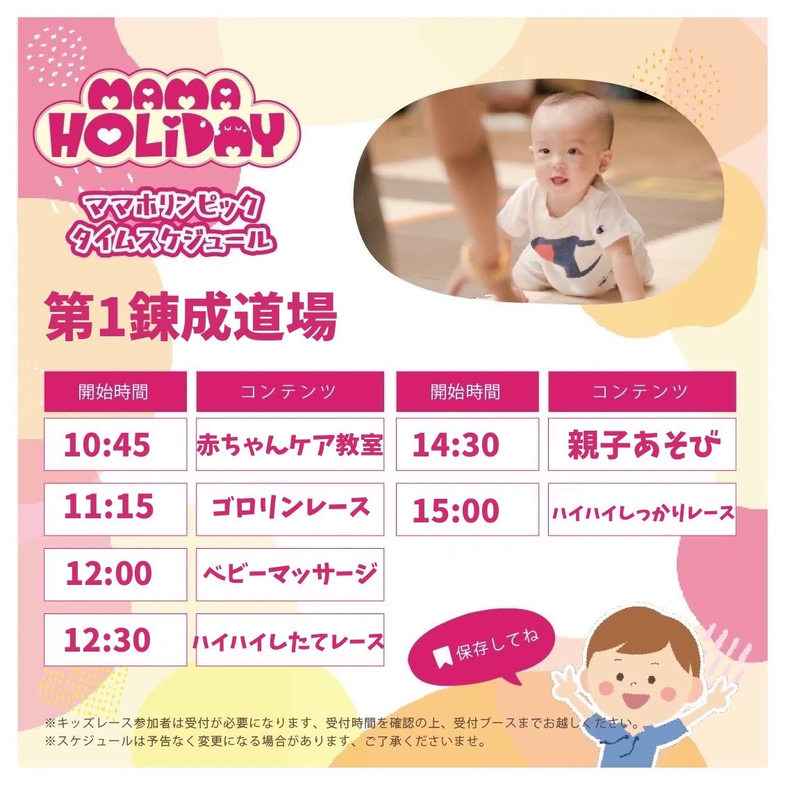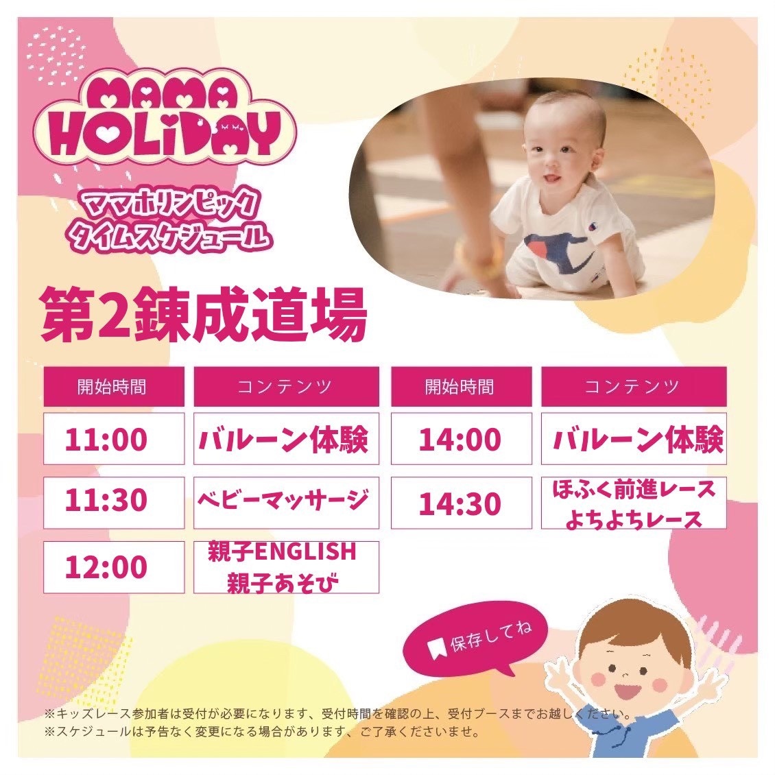 第一・第二錬成道場それぞれでのステージ企画・レース企画・ママユメエリア講座無料体験と企画も盛りだくさん!